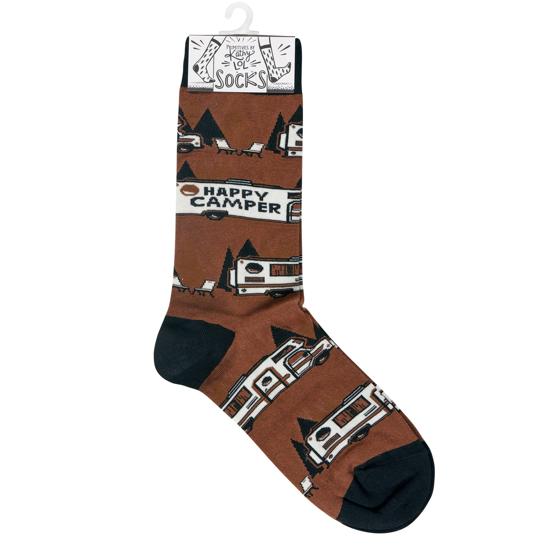 A pair of colorful socks from our Lake & Cabin Collection displaying unique hand illustrated designs of campers with a fun camping-themed sentiment that reads "Happy Camper." Socks feature a one size fits most design made with cotton, nylon, and spandex. Our Happy Camper socks come with a header card and a clear plastic hanger for display. A fun camping-themed gift perfect for everyday self-expression.